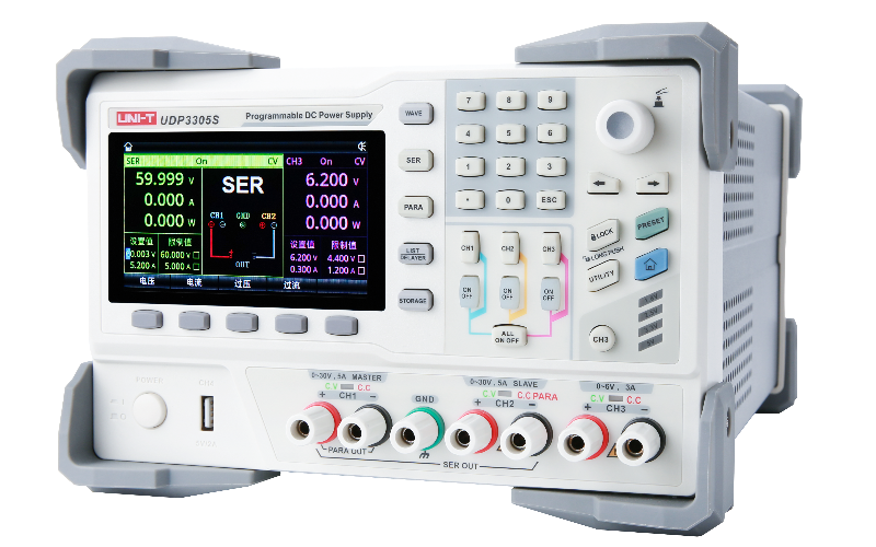 UDP3000S系列可编程线性直流电源有两路30V/5A输出、一路6V/3A和一路标准USB输出,产品4.3英寸TFT大屏提供丰富的功能界面,使列表/延时器功能、触发器、监测器功能、波形显示功能、系统设置和输出预设功能等便捷易用。