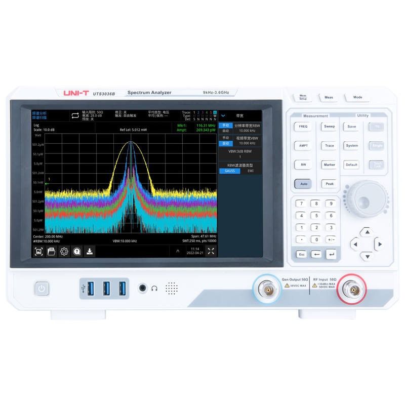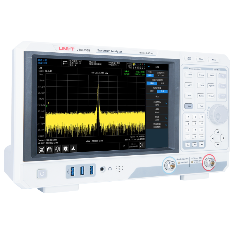 UTS3000B频谱分析仪是一款便携式、功能多样的频谱分析仪,提供9kHz~8.4GHz的频率测量范围分辨率带宽低至1Hz,拥有10.1英寸多点触控显示屏采用成熟的数字中频技术,频率扫描点数高达40001 ,提供更高的分辨率。拥有频谱分析、EMI、高级测量等多种工作模式可应用于电子制造业的功能/终端/质检测试,也适用于无线通信测量,射频微波课程,电磁兼容预扫,半导体测量等众多应用场景中。