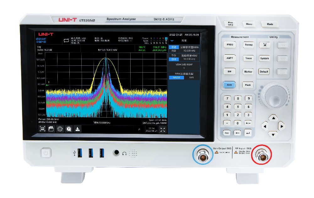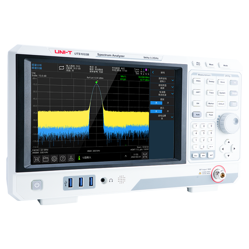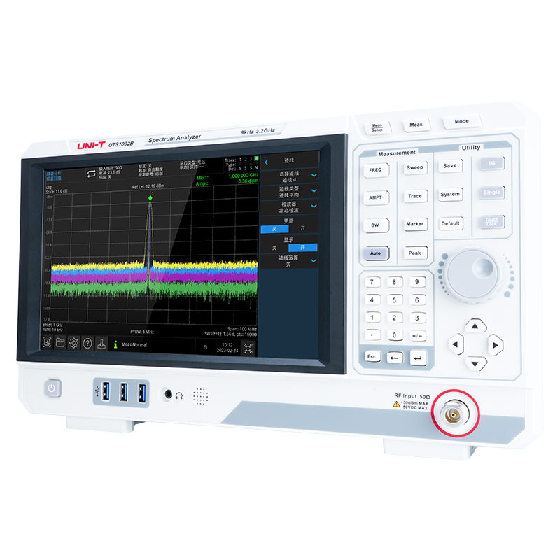 优利德UTS1000B系列频谱分析仪包含5个型号: UTS1015E/UTS1015B/UTS1032B/UTS1015T/UTS1032T,可以测量高达3.2GHz的信号。 UTS1000B采用成熟的数字中频技术,采用10.1英寸高清电容触摸显示屏,同时具备稳定、优异的性能,是一款具有宽带覆盖和卓越性能的经济型频谱分析仪。不仅可应用于企业研发、工厂生产、维修等领域,同时也可以是科研、教育教学领域设备的优秀之选。