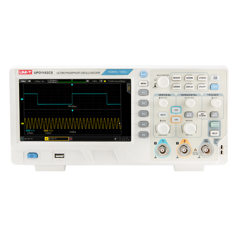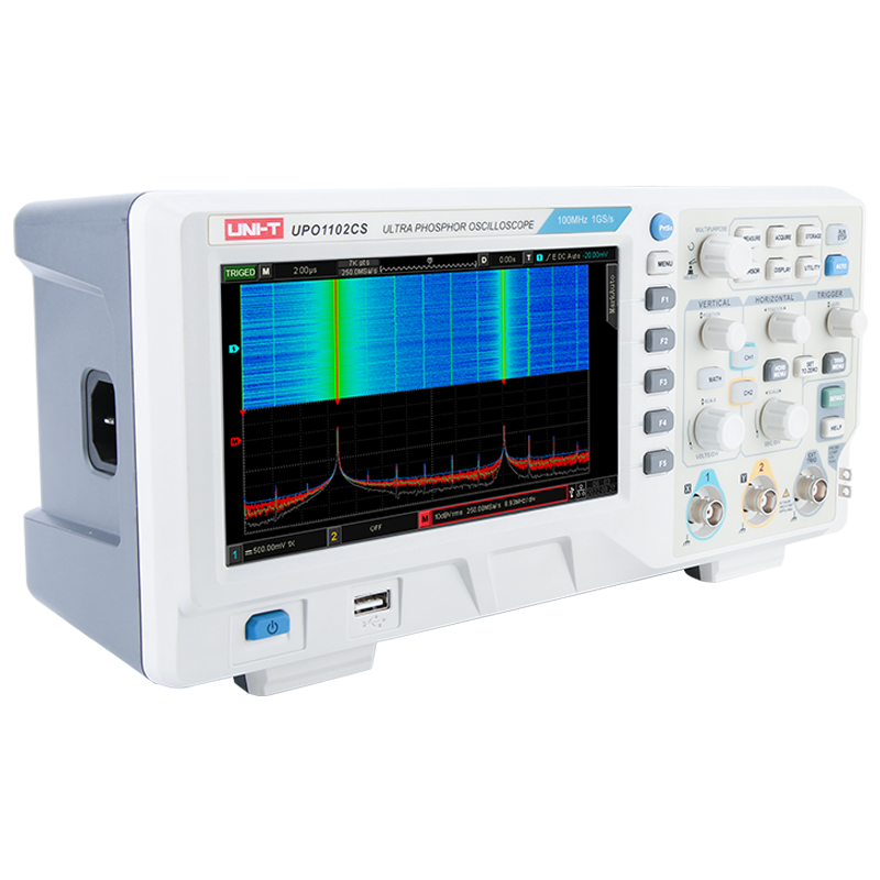 UPO1000CS系列采用并行数字信号处理技术,提高了数据处理速度及波形捕获速率,独创的Ultra Phosphor 2.0技术将被测信号频率以类似模拟示波器的多层次余辉呈现,相较于传统数字存储示波器,数字荧光示波器的余辉效果能更好呈现出振幅、时间和信号强度的三维波形数据。