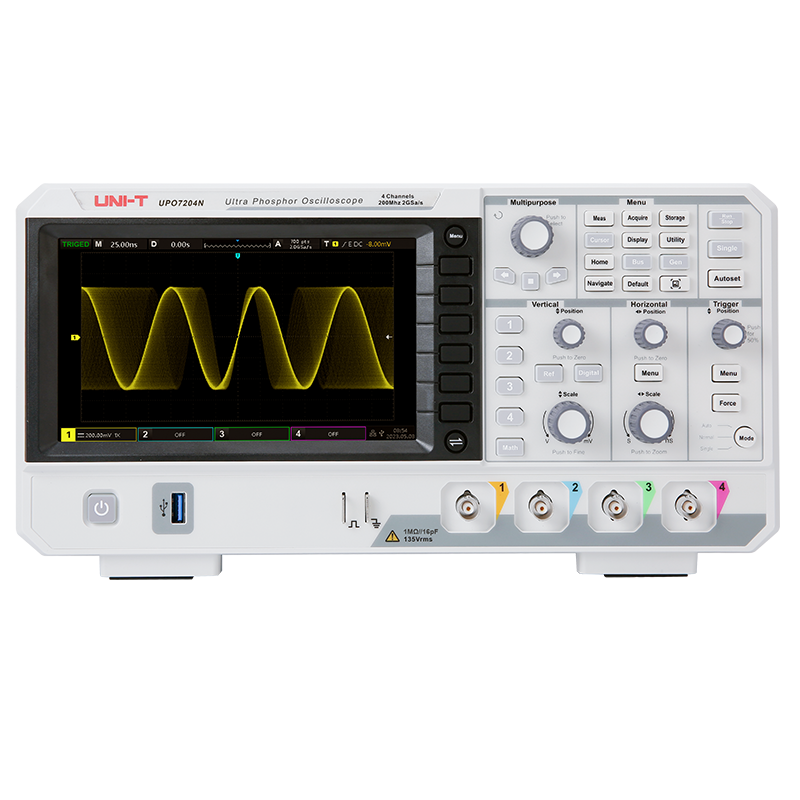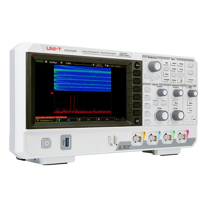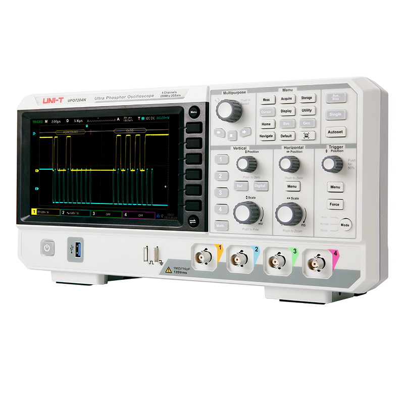 UPO7000N系列数字示波器采用了UNI-T新创的数字三维技术,全新外观升级,可实现深存储,高波形捕获率,实时波形录制与回放,256级灰度显示等功能;该系列配置100MHz/200MHz 两个级别带宽,实时采样率高达2GSa/s,全系列标配4通道,标配最大存储深度56Mpts, Fast Acquire模式下最高可达500,000wfms/s,硬件实时波形不间断录制和波形分析功能最大达12万帧波形;支持独立的DVM模块,拥有丰富的触发和总线解码功能,并支持全内存硬件实时解码;广泛应用包括通信,半导体,计算机,集成电路设计,仪器仪表,工业电子,消费电子,汽车电子,现场维修,研发/教育等众多领域。