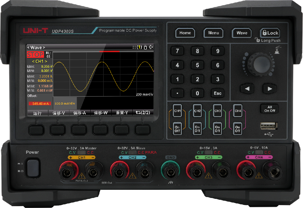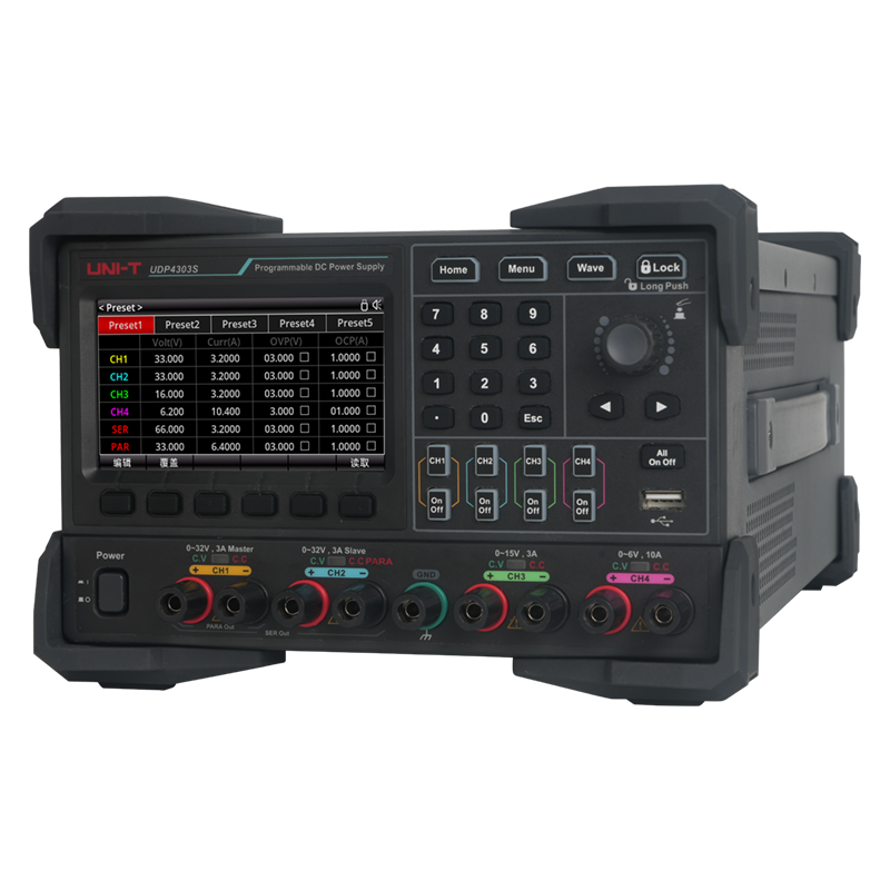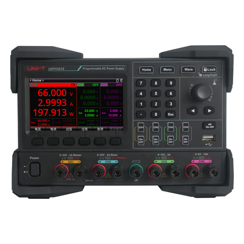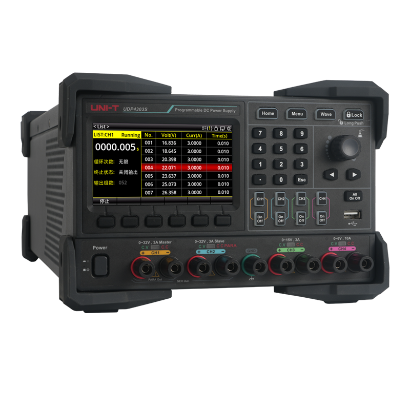 UDP4303S可编程线性直流电源设计4个独立通道。CH1/CH2能够提供32V/3A输出,支持一键等性能串并联;CH3独立通道提供15V/3A输出,CH4独立通道提供6V/10A输出。该直流电源具备4通道电压、电流、功率波形实时显示功能,另有列表、监测器、触发器、录制器等电源完备的功能。UDP4303S支持USB Device、DIGITAL IO、RS-232、LAN通讯,遵循SCPI标准协议,命令处理时间<10ms。此外,UDP4303S具有稳定可靠的性能和用户友好的操作界面,操作简便,适用于半导体、传感器、IoT及智能穿戴等领域。
