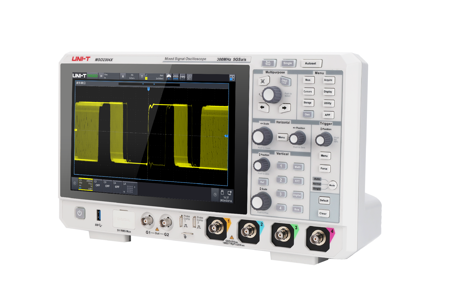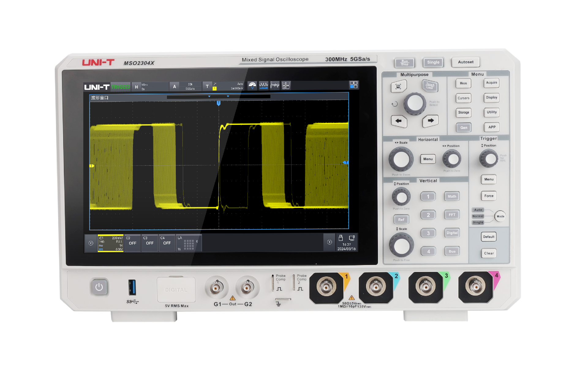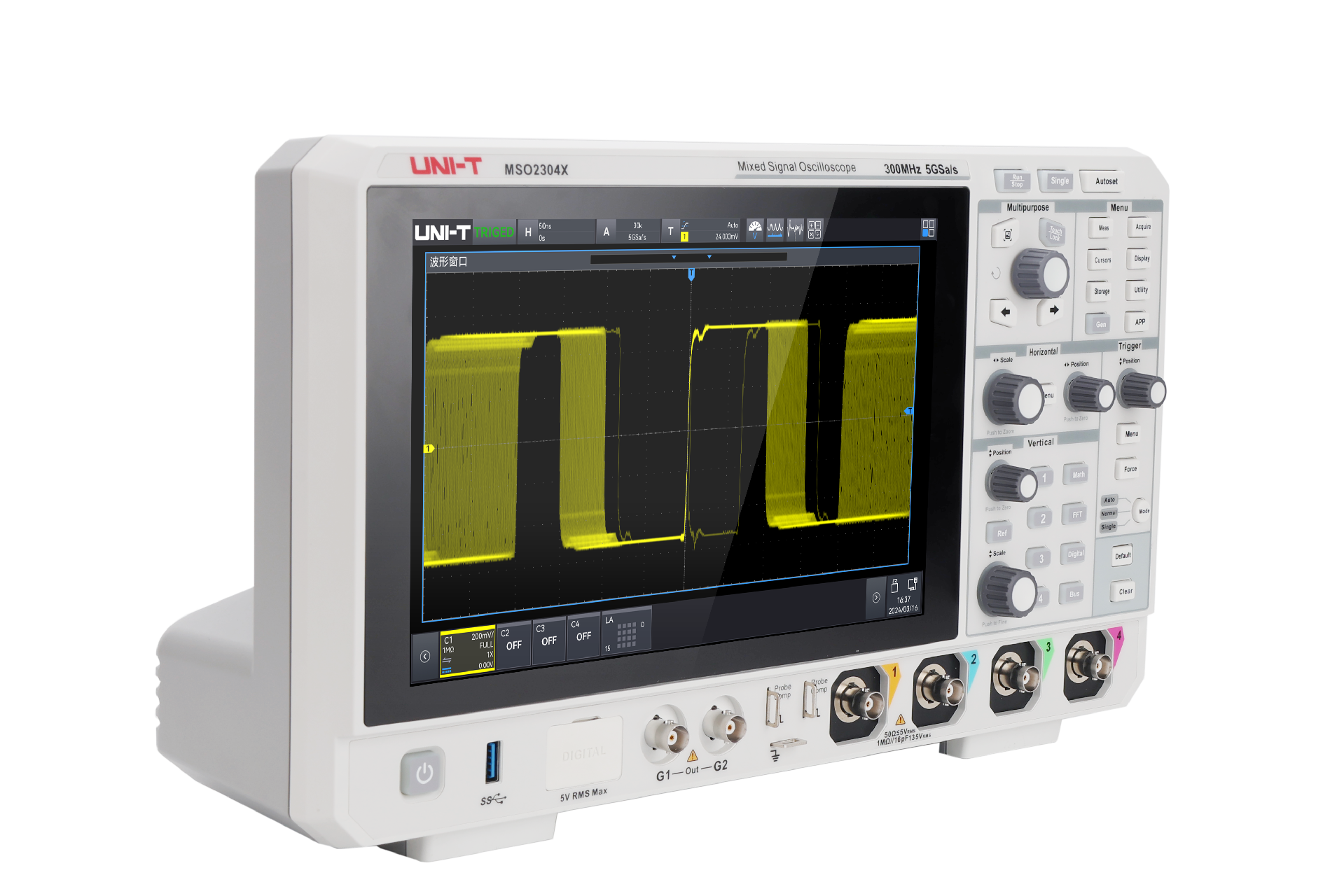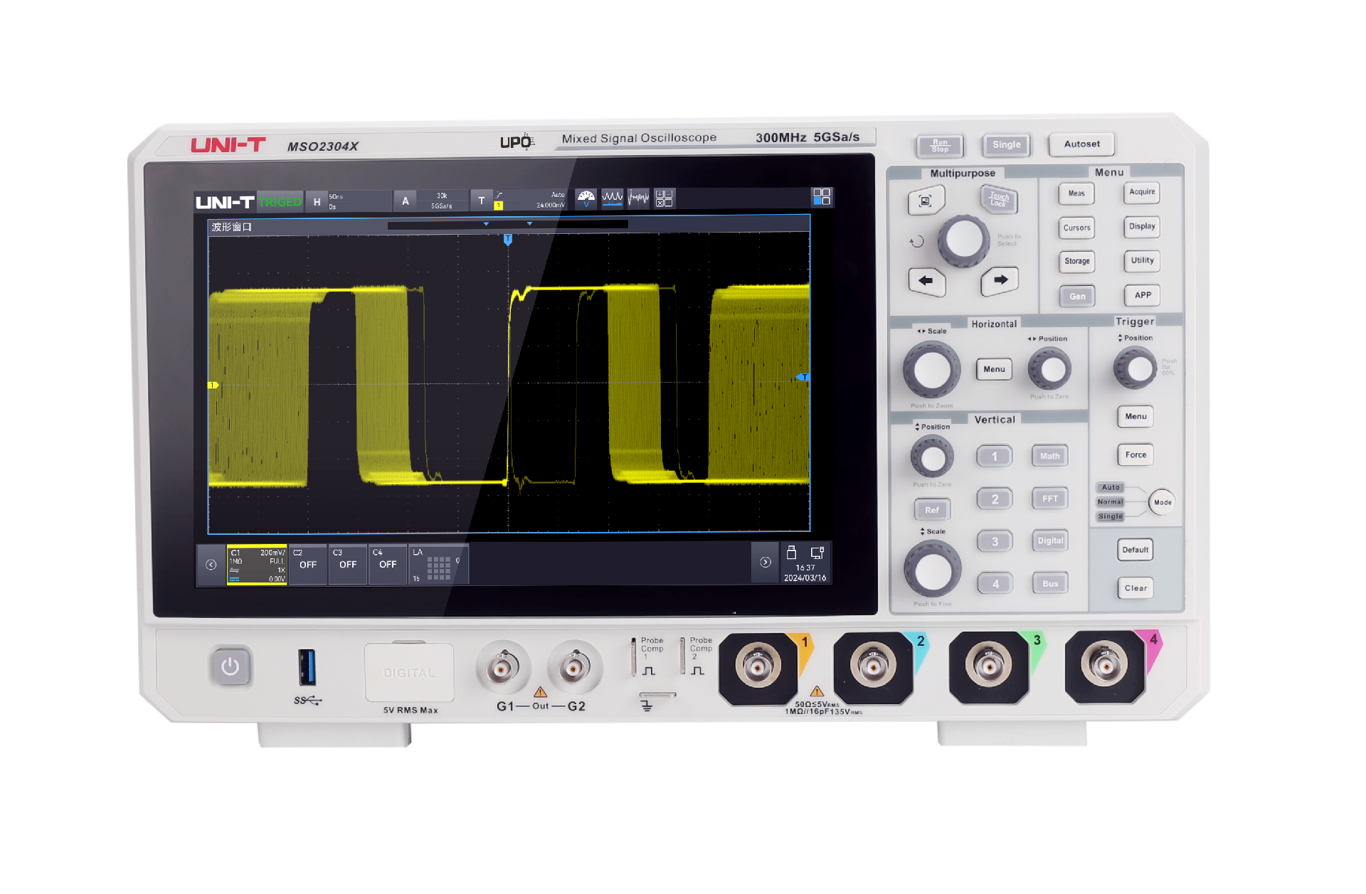 MSO2000X系列混合信号示波器,采样率最高5GSa/s,每通道存储深度可达100Mpts。采用独有的 Ultra Phospho® 3.0技术,波形捕获率高达2,000,000 wfms/s,具有 256 级辉度等级色温显示,先进的数字触发系统,触发灵敏度高,触发精度达到10ps;支持多种高级触发、串行总线触发和解码;支持频谱分析、电源分析、直方图、波形录制、增强分辨率、通过测试、搜索和导航等高级功能和分析模式;具备丰富的测量和数学运算功能。采用了 10.1 英寸电容式触摸屏,支持多种手势实现对波形的常用操作,以及WebServer实现远程操控一款功能全、性能强大的仪器设备。