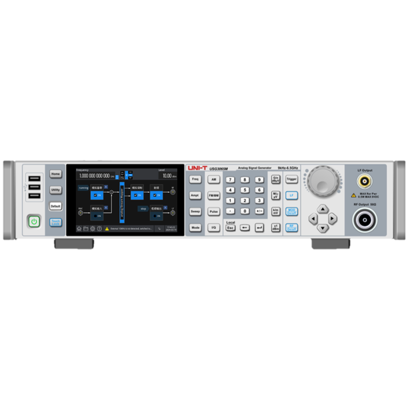USG3000M系列整机采用2U标准高度机箱,输出频率高达6.5GHz,频率分辨率小于1mHz,较宽的频率覆盖范围,可以用于本振上变频或者连续波阻塞的测试。在功率输出方面,最大可输出+25dBm及-60dBc杂散抑制,配合我们精确的步进衰减器,更适用于微波元器件,它可以为滤波器、放大器、接收机等器件及模组测试提供必要的信号。