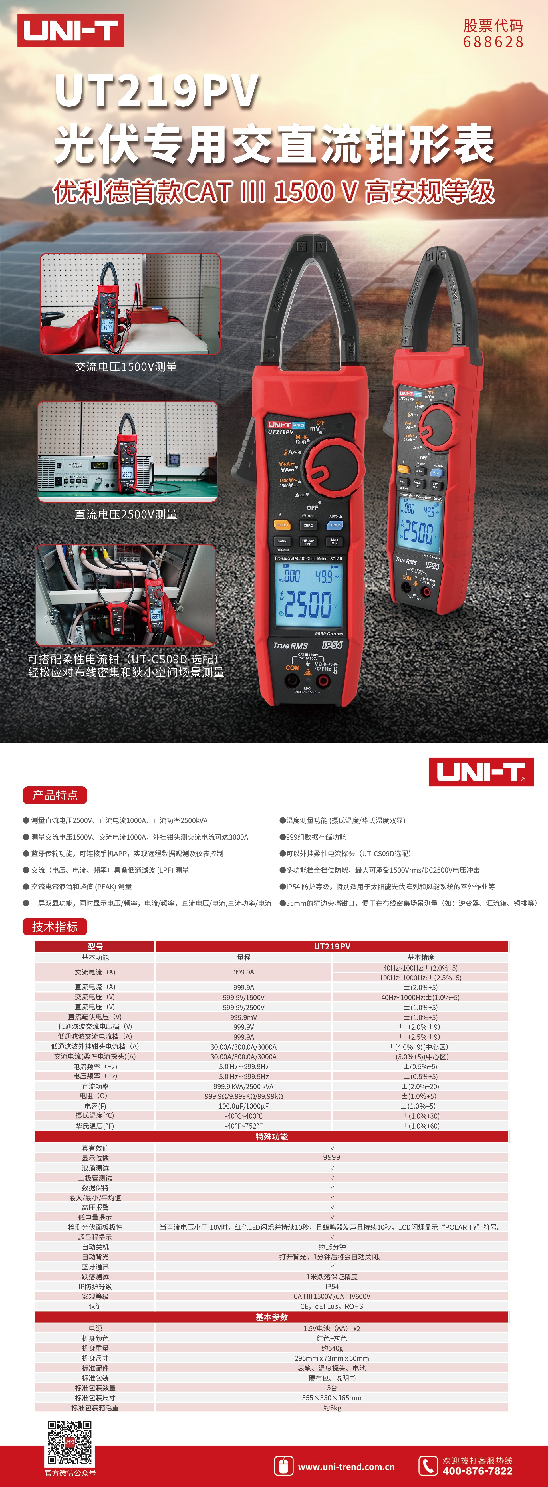 测量交流电压1500V、交流电流1000A,外挂钳头测交流电流可达3000A。