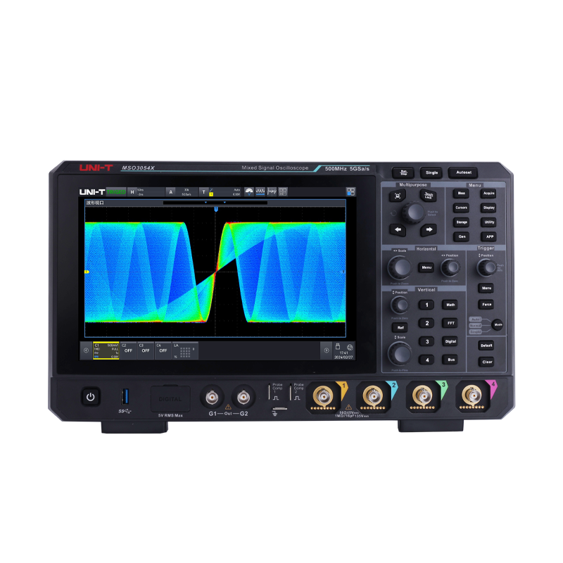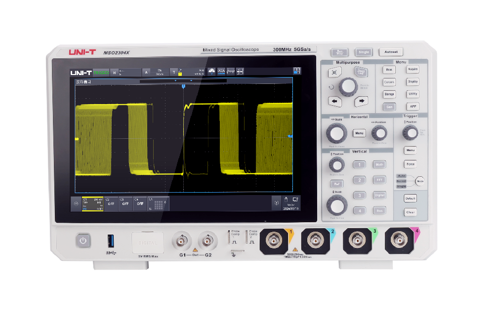 MSO3000X系列混合信号示波器,采样率最高5GSa/s,每通道存储深度可达500Mpts。采用独有的 Ultra Phospho® 3.0技术,波形捕获率高达2,000,000 wfms/s,具有 256 级辉度等级色温显示,先进的数字触发系统,触发灵敏度高,触发精度达到10ps;支持12种高级触发、12种串行总线触发和解码;支持频谱分析、电源分析、直方图、波形录制、增强分辨率、通过测试、搜索和导航等高级功能和分析模式;具备丰富的测量和数学运算功能。采用了 10.1 英寸电容式触摸屏,支持多种手势实现对波形的常用操作,以及WebServer实现远程操控一款功能全、性能强大的仪器设备。